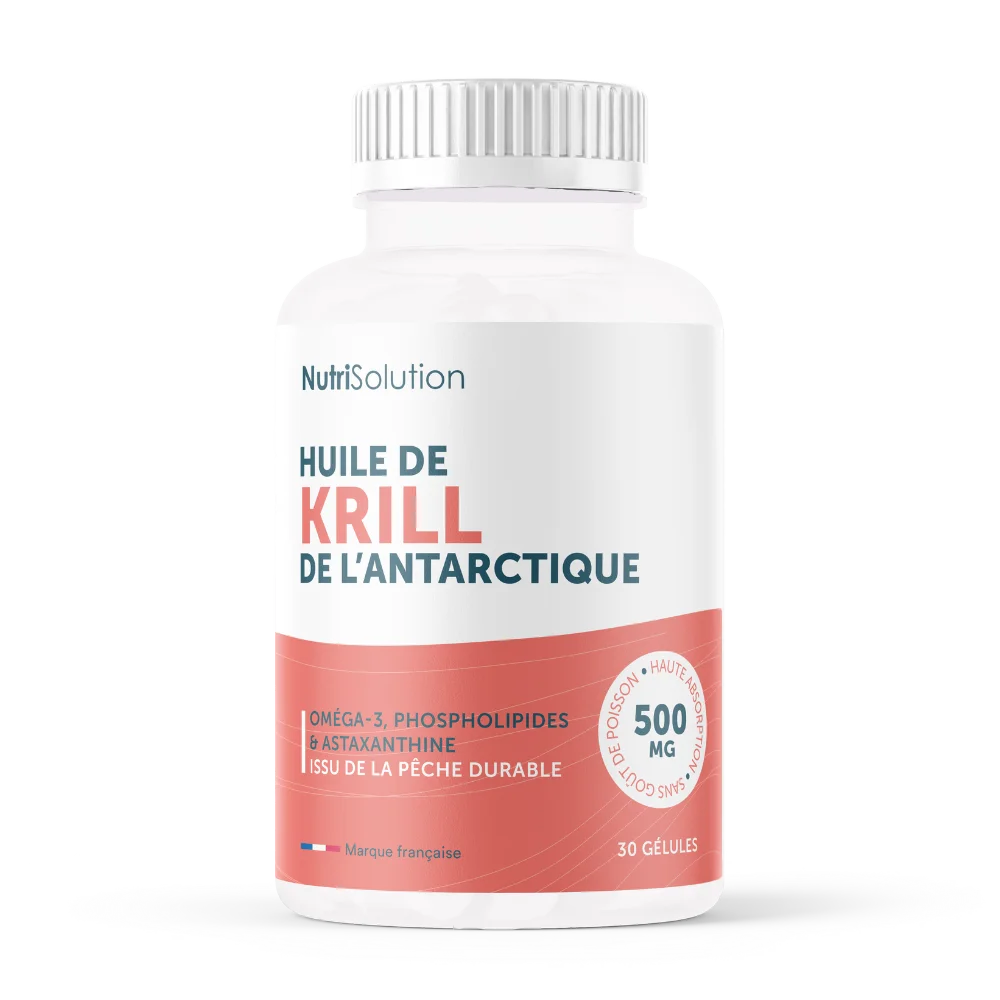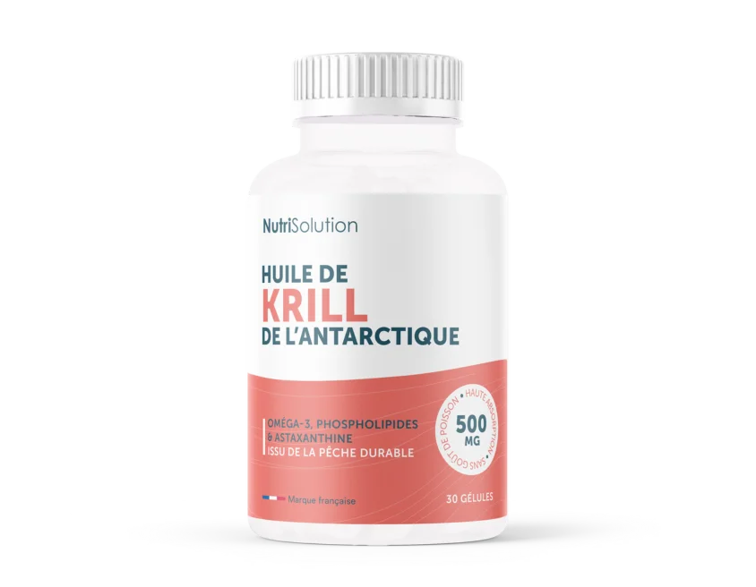 Chaque boîte contient trente gélules de 500 mg d’Huile de Krill Antarctique NutriSolution.